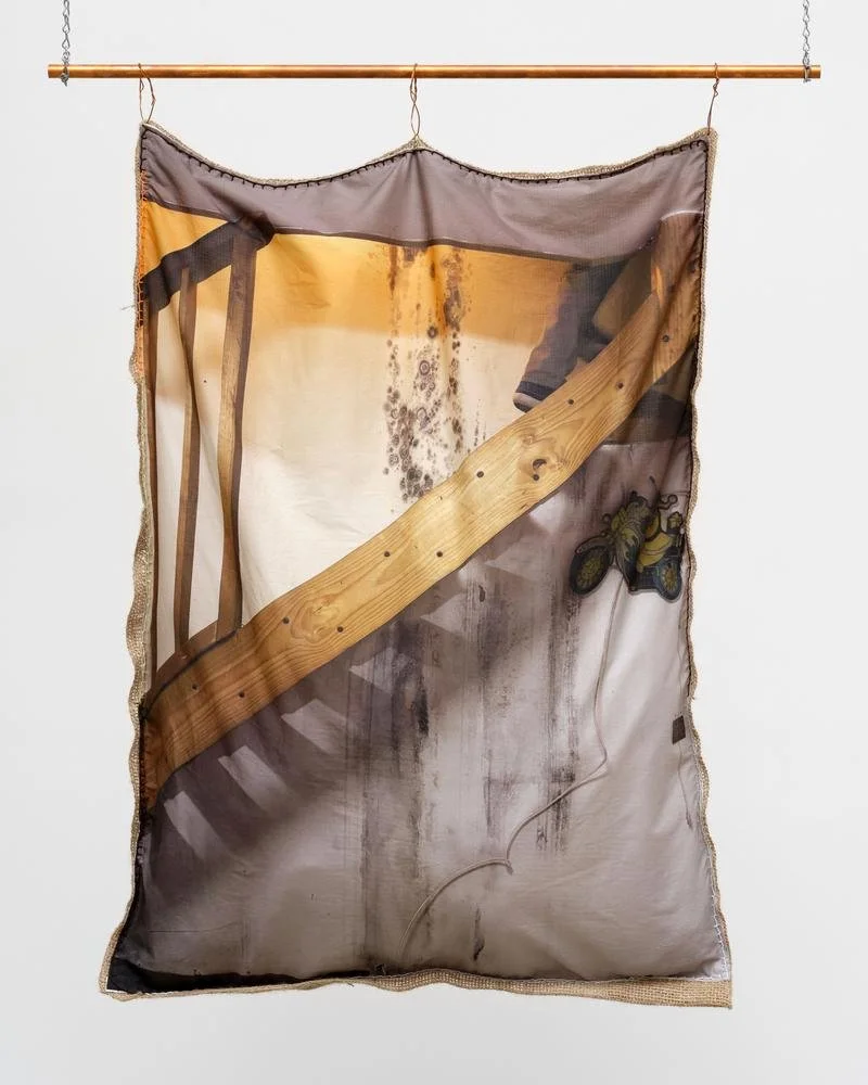Photographic arpillera: photograph printed on cotton, burlap, polyester embroidery thread, poly stuffing